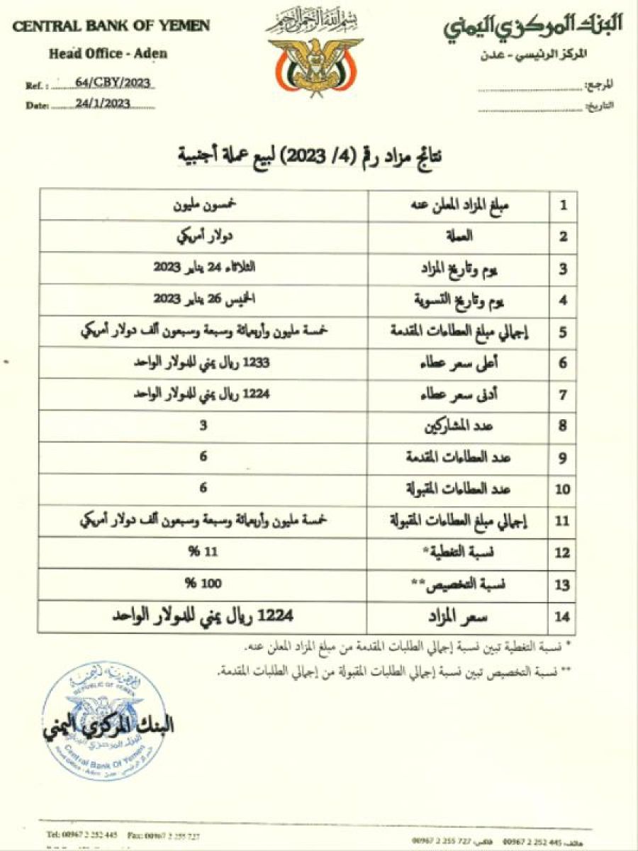 يعلن البنك المركزي اليمني اليوم الثلاثاء الموافق 24 يناير 2023م، عن نتائج المزاد رقم (4-2023) لبيع عملة أجنبية، والتي أعلن عنها يوم الخميس الماضي.